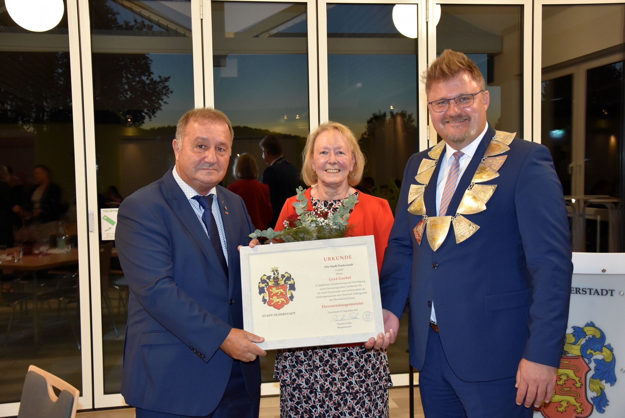 Einen besonderen Dank richtete Bürgermeister Feike an die Familie Goebel. Diese habe ihn in der Vergangenheit unterstützt und musste ihn das ein oder andere Mal aufgrund des Engagements missen. Es folgte die Übergabe der Urkunde zum Ehrenortsbürgermeister und einer Ehrengabe der Stadt Duderstadt. Frau Goebel erhielt einen Blumenstrauß, auch wenn „dieser nicht den Dank ausdrücken kann“, der ihr eigentlich gebührt.