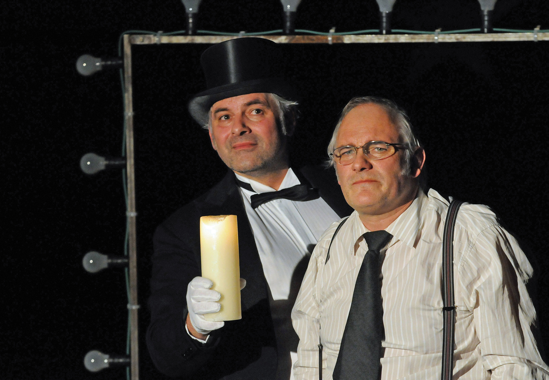 Stefan Dehler und Christoph Huber schlüpfen seit fast zehn Jahren im Advent in die Rollen des notorisch zynischen Scrooge, des sorgenvollen Angestellten Bob Cratchit und der Geister der Weihnacht. Ihre äußerlich reduzierte, aber durch und durch szenisch fantasievolle, komisch pointierte Theaterfassung der berühmten Erzählung von Charles Dickens hat in der Region schon beinahe Kultstatus erlangt.